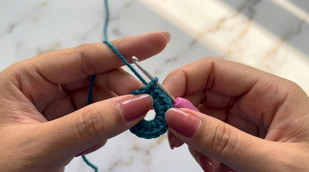 - Join the first stitch with a slip stitch and chain one. (Round 1 complete)
