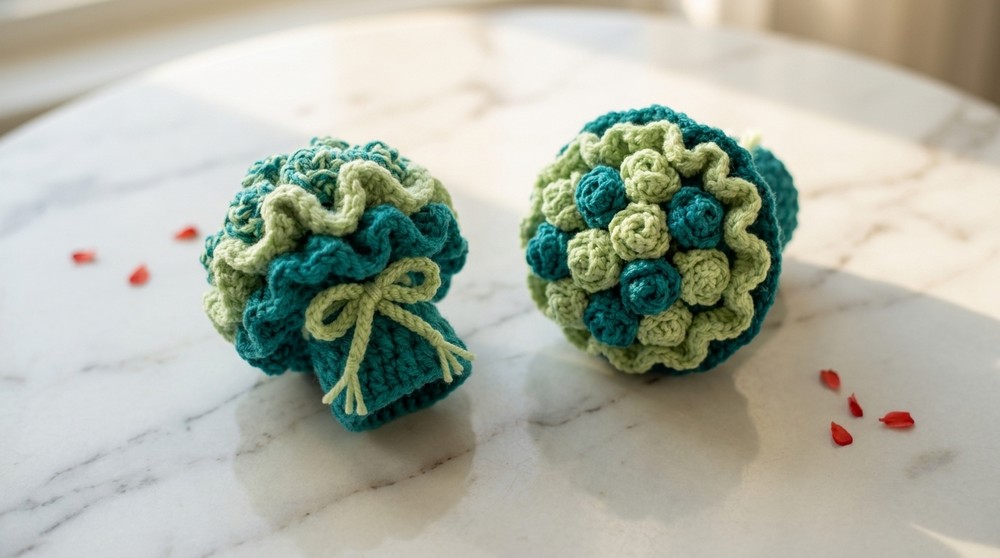- Gauge is not critical for this project. However, ensure that stitches are tight and uniform to achieve a compact bouquet structure.