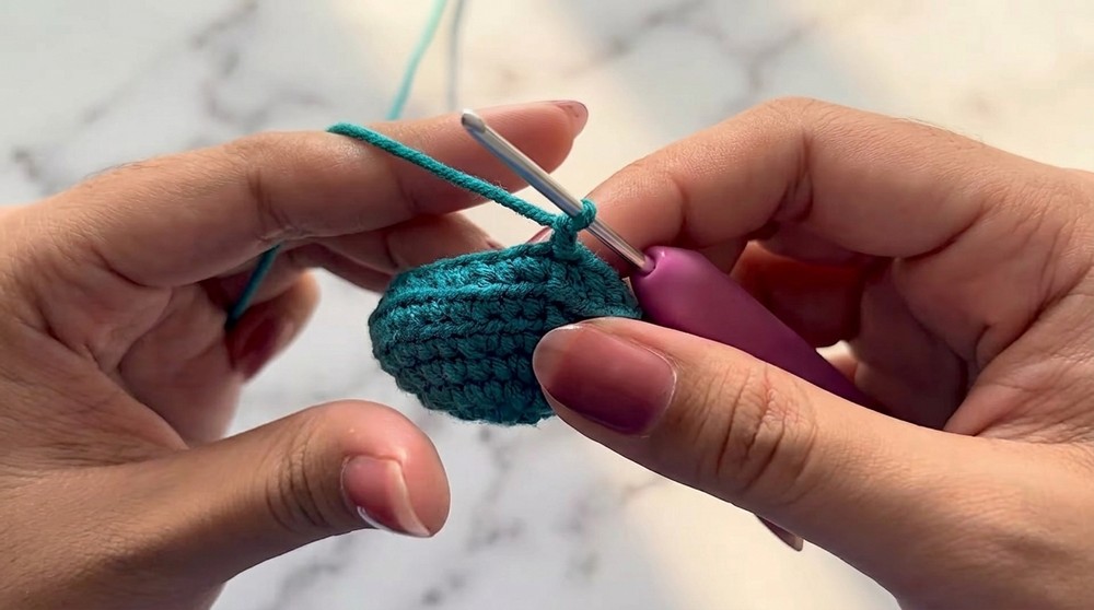 - Round 1: Create 8 single crochets (SC) into the magic ring. Use a stitch marker on the first stitch. Pull the yarn tail to close the ring tightly.