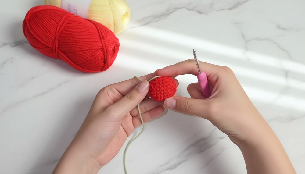 - Use green yarn. Attach it to the top of the cherry (the last round). Insert the hook into a random stitch near the gap.