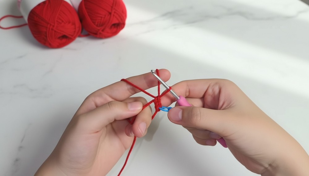 - Wrap the pink yarn around your fingers to form a magic ring. Secure the loop with your hook.