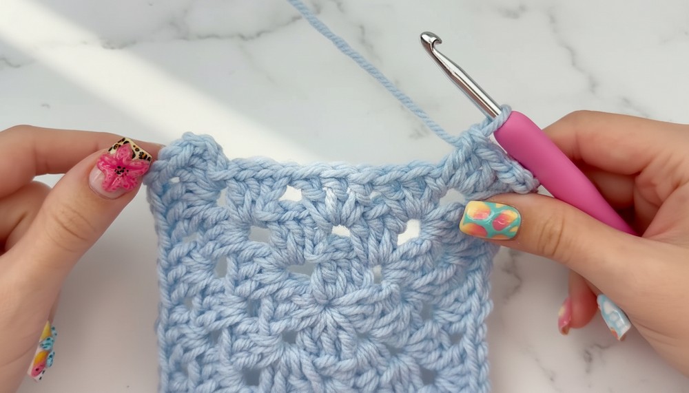 - In each corner, work 3 double crochets (dc), chain 2, and another 3 double crochets (dc).