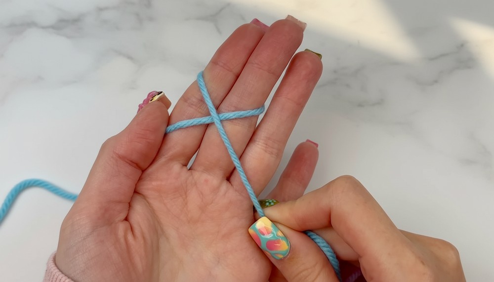 - Wrap your yarn around two fingers, cross it, and form a loop. Insert your hook under the first strand, pull the second strand through, and tighten to form a knot.