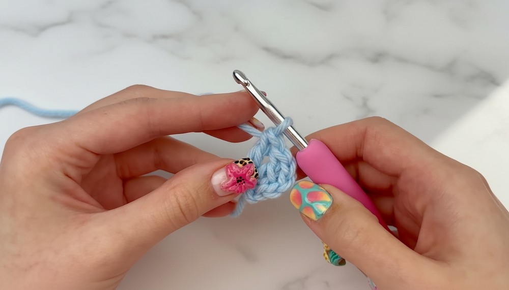- Join the round by inserting your hook into the top chain of your starting chain (the third chain from the bottom) and making a slip stitch (sl st).