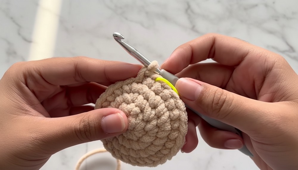 - Insert 12 mm safety eyes between Rounds 6 and 7, with a 4-stitch gap between them.