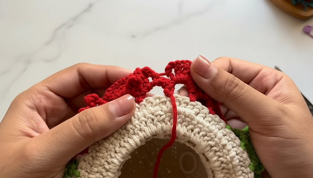 - Attach pink or red yarn to the first double crochet space of the leafy green accent.