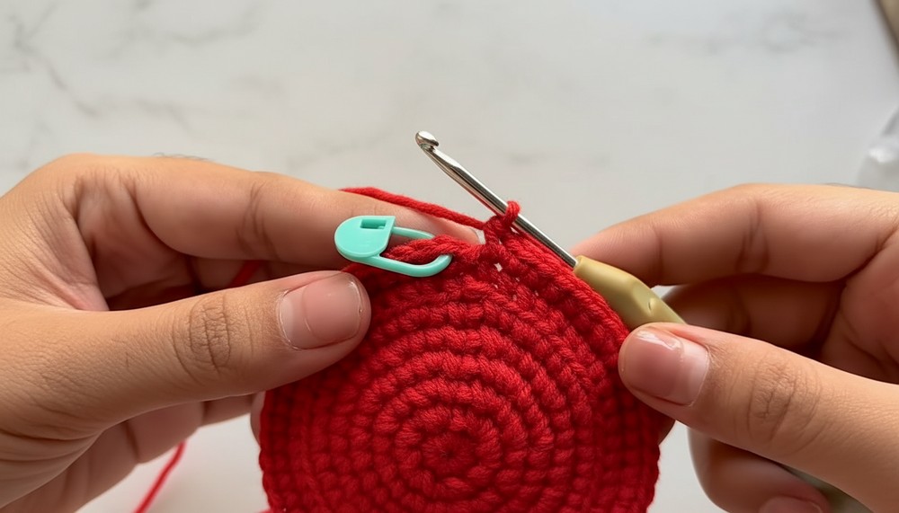 - Round 1: Start with a magic ring, crochet 8 sc into the ring. Pull the yarn tail to close the ring. Mark the first stitch with a stitch marker. Join with a sl st to the first stitch. Ch 1. (8 stitches)