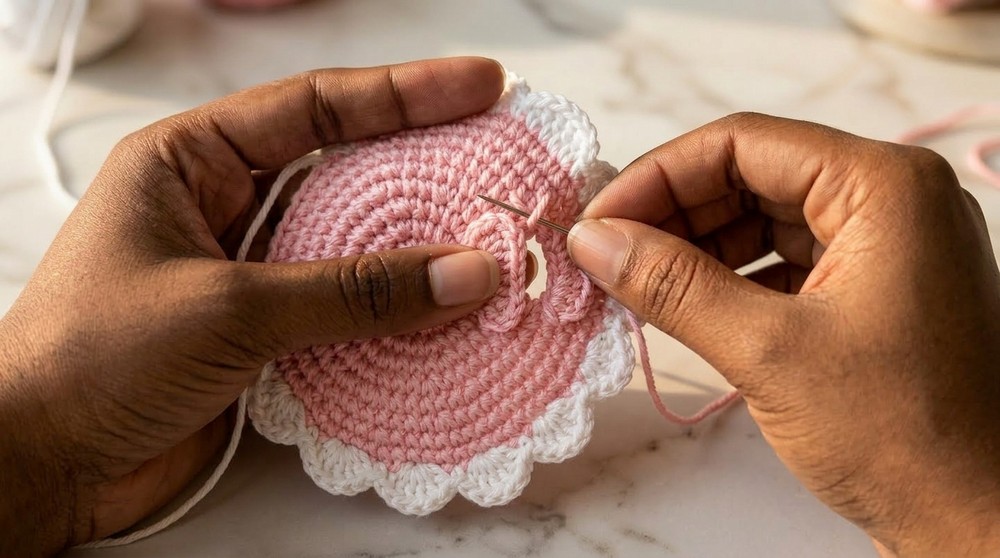 • Attach the yarn tail to a tapestry needle. Insert at the first st of the final round (skip sl st and chain). Weave neatly to secure.