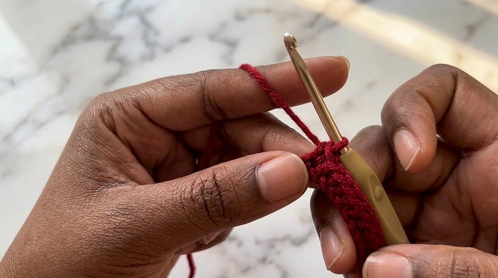 • Starting from the 2nd chain from the hook, make 19 single crochets (sc).