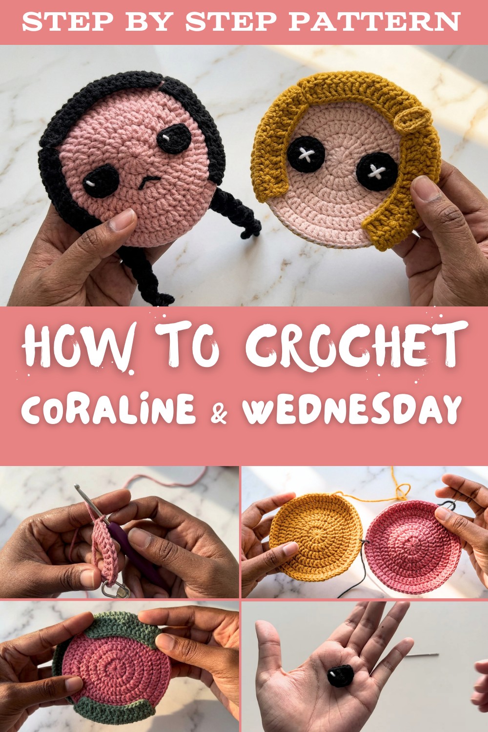 - Hair Construction: Coraline’s hair is fuller, requiring three rounds for each section. Wednesday’s hair is simpler, worked in fewer rounds with braids for added detail.