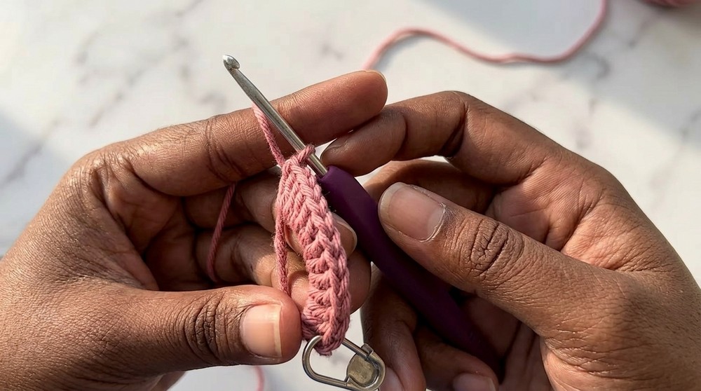 - Ch 15, and starting from the second ch, work 1 sl st, followed by 13 sc.