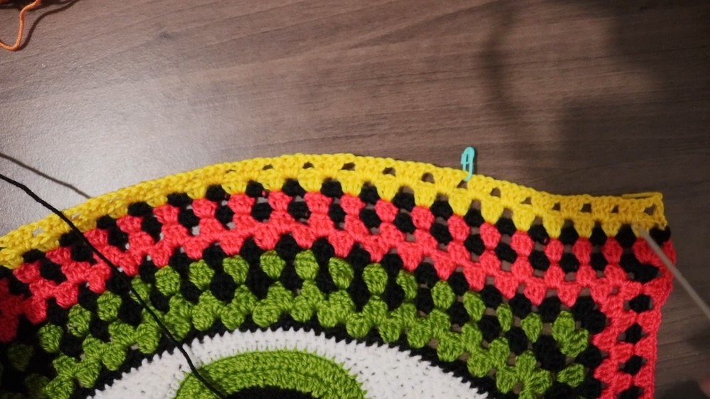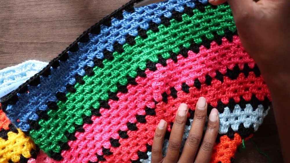 - Row 2 to Row 5: Continue working granny square clusters in each space, maintaining corners by working 2 clusters, Ch 3. Alternate colors and switch to black or other chosen colors.