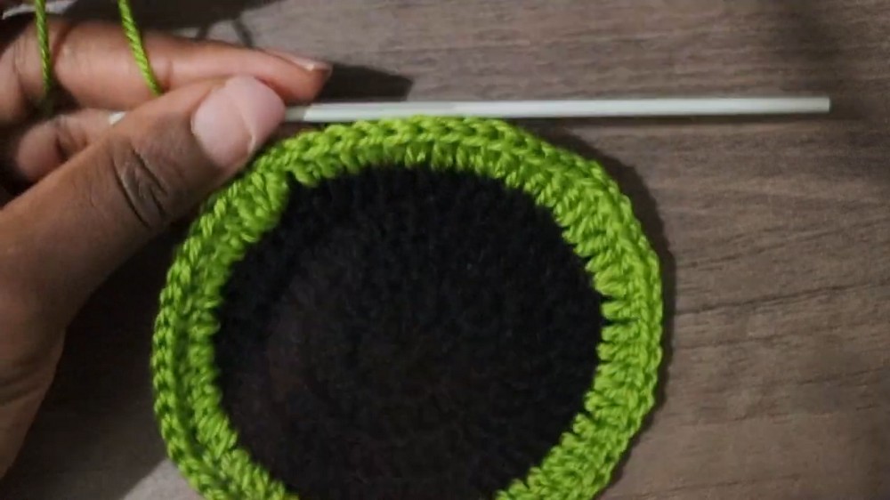 - Row 1: Attach green yarn to the outermost edge of the white round eye. Work Clusters (3Dc) into each space across the rows, with 2 clusters and Ch 3 in each corner space.