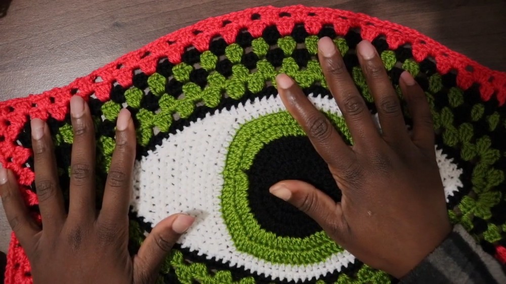 - Using the center "Eye," attach green yarn to begin granny square rows.