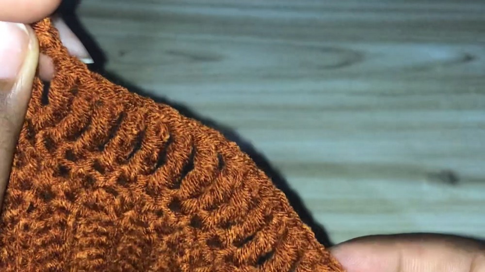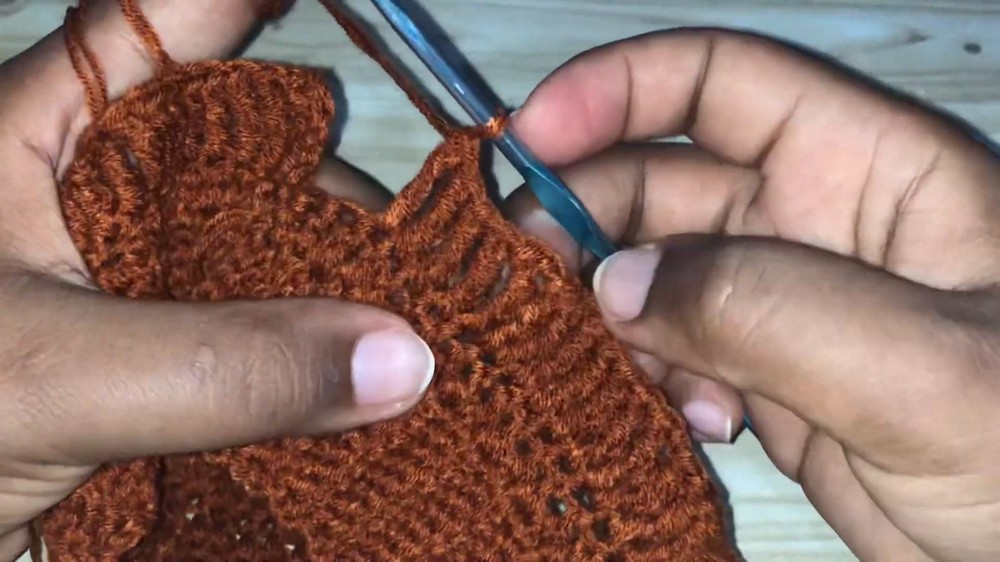 - Skip the last 5 chains, work 1 treble in each chain starting from the base of the skipped chains, all the way across.