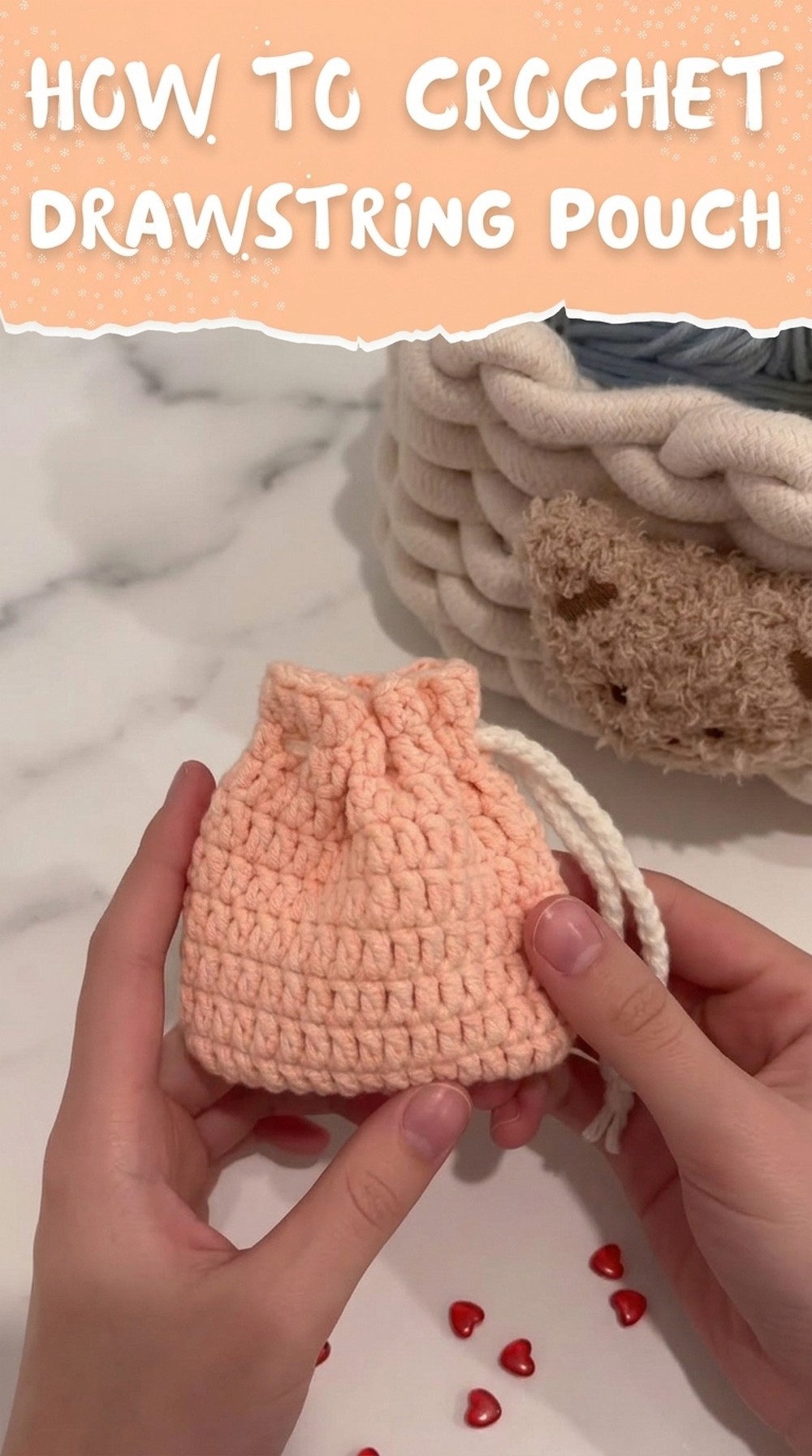 - Use different colors if preferred (e.g., peach colour for the pouch body and white for the drawstring).