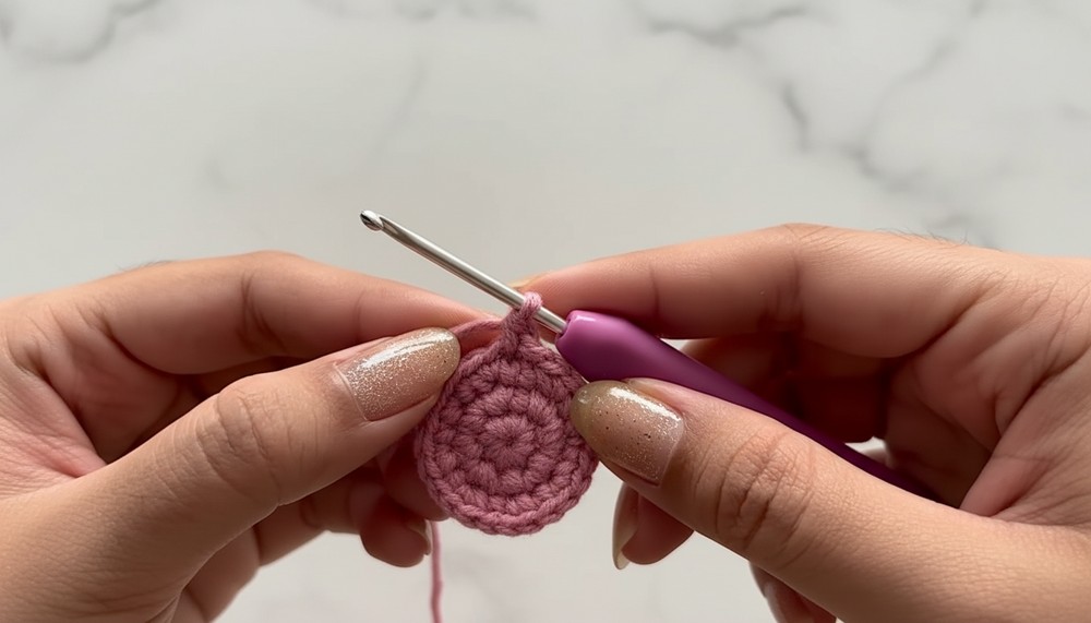 - Pull the yarn tail tightly to close the ring. Slip stitch to the first stitch and chain 1. (Round 1 complete)