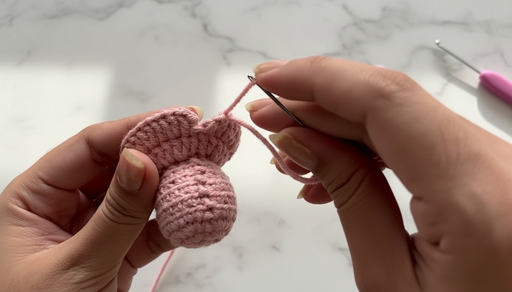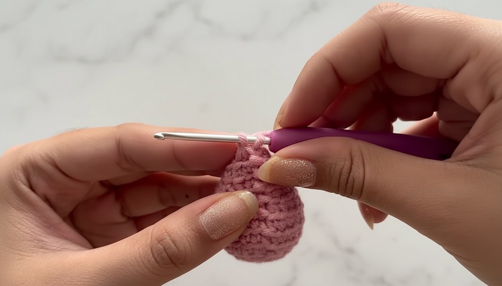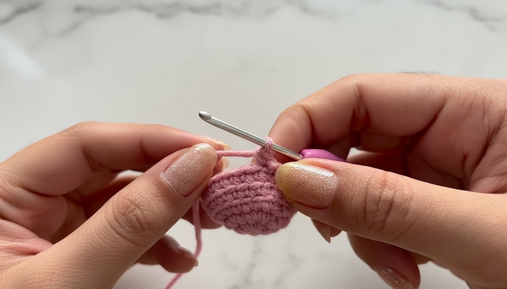 - Locate the back loops of Round 8. Attach yarn, chain 2, and begin Round 1: