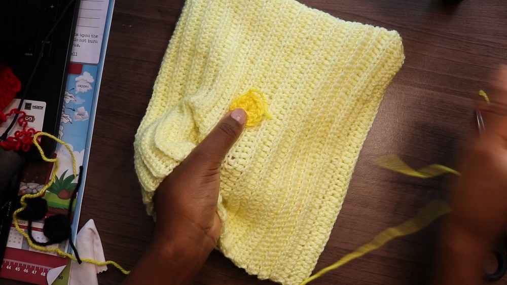 - Leave two long ends from the wrap for sewing onto the beanie later.