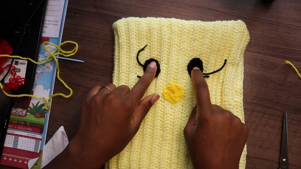 - Sew the whiskers below the eyes, ensuring symmetry.