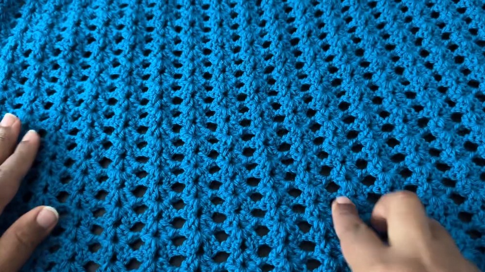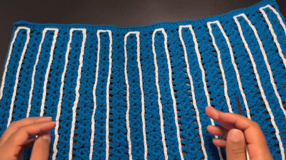 - Repeat the shell stitch pattern across the row, ch 1 between shell stitches.