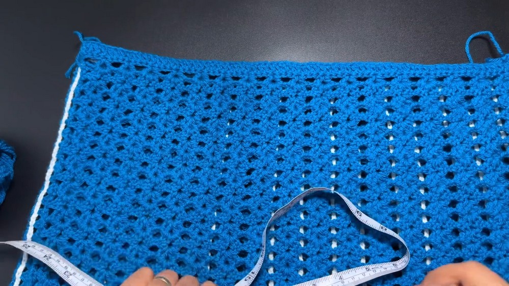 - Use a stitch marker to mark 3 inches from each edge for shoulder seams.