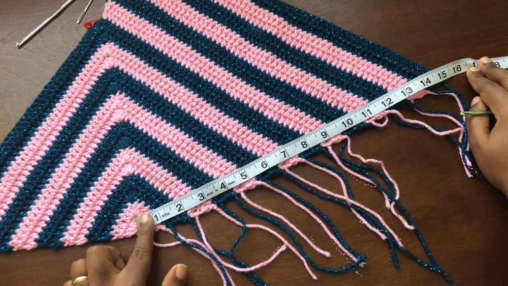 - Complete the desired number of rows for your v-neck. Example: The tutorial followed 12 rows on each side, measuring about 15 inches wide.