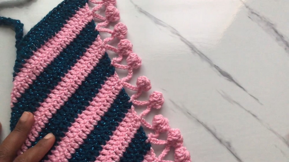 At the edges of the v-neck triangle points, you’ll create chains to make a tie-back closure.
