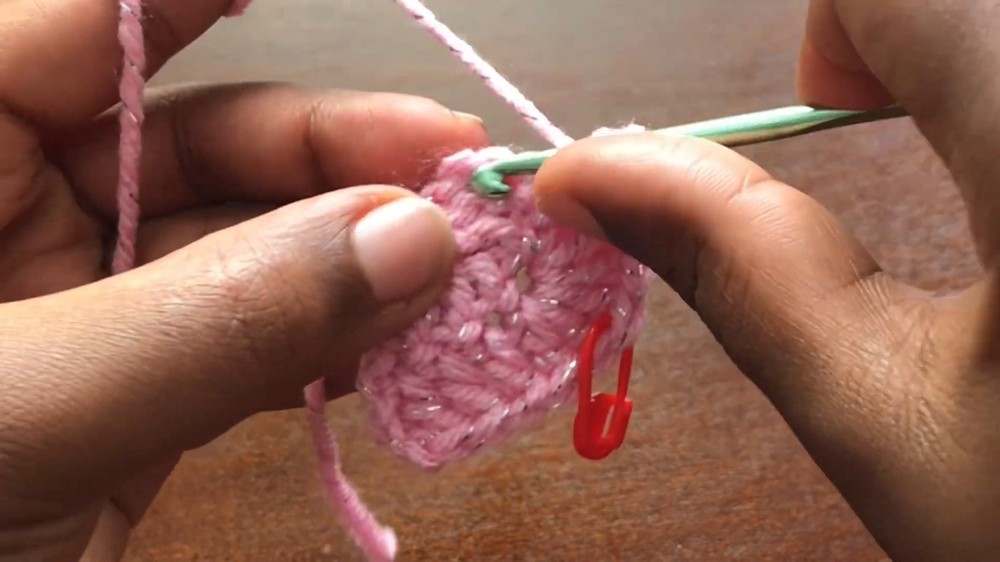 - Remove the stitch marker and make 5 DCs into the marked stitch space (creating increases at the center).