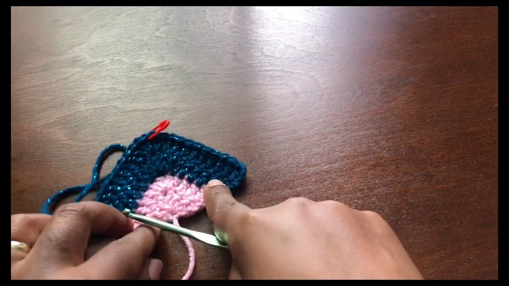 - Mark the 3rd stitch of the 5 DC cluster with a stitch marker.