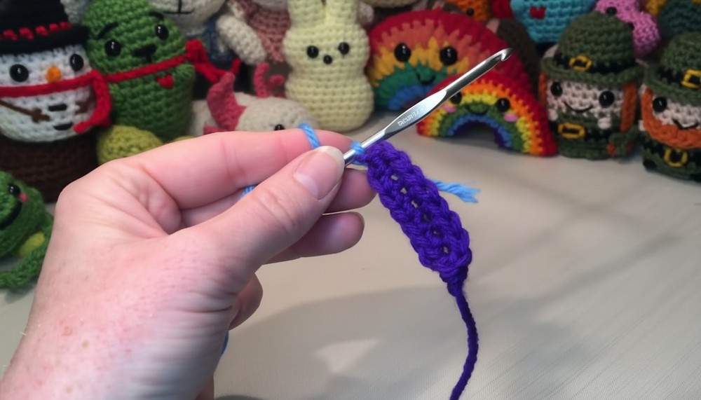 - Attach the second color (e.g., blue) by tying the two ends close to the hook. Chain 1 with the new color to start the next round.