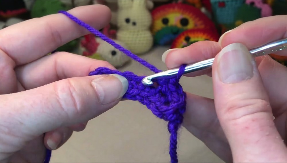 - Without turning, continue working on the back side of the chain. Work another 8 sc into the chain. (16 sts total for the first round).