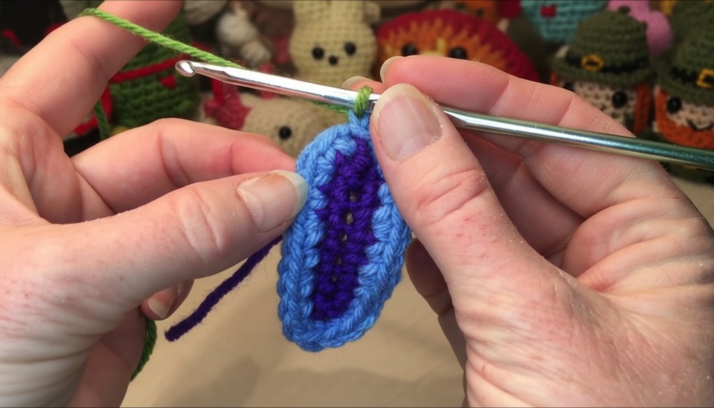 - Slip stitch into the first stitch of the round and switch to the next color (green).