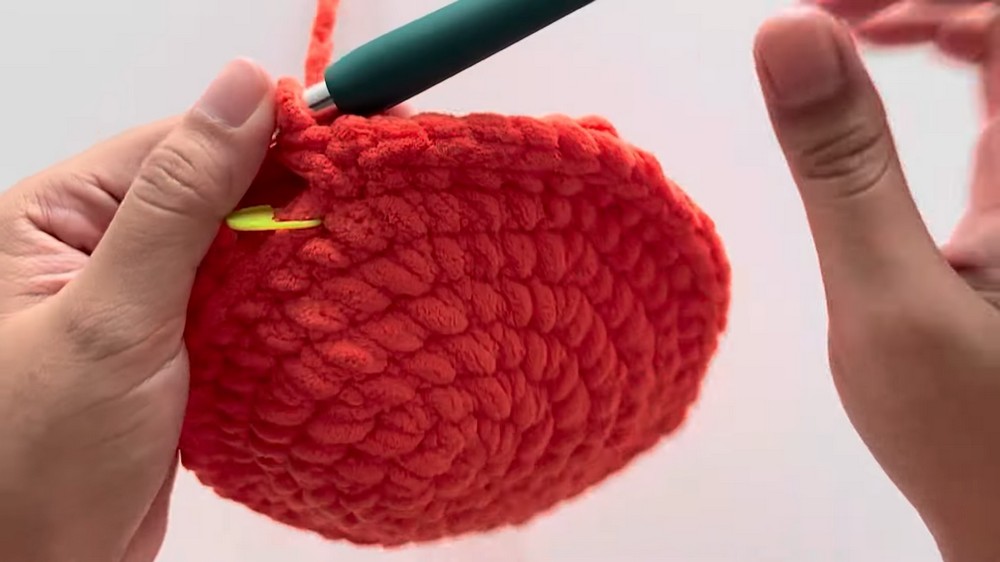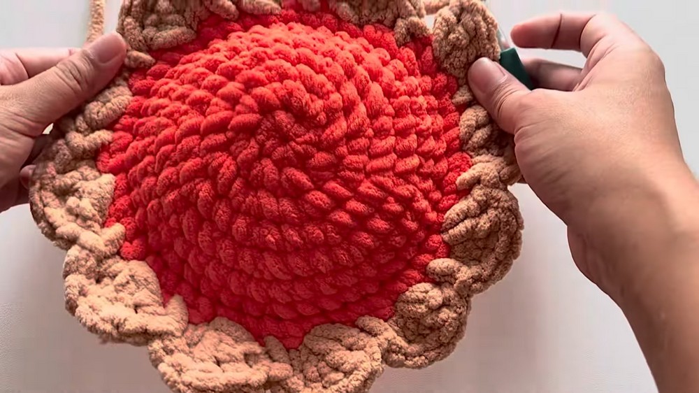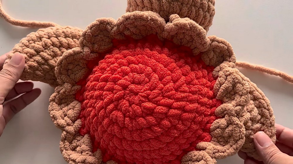 Make using orange yarn. Follow Rounds 1–5 of the upper shell.