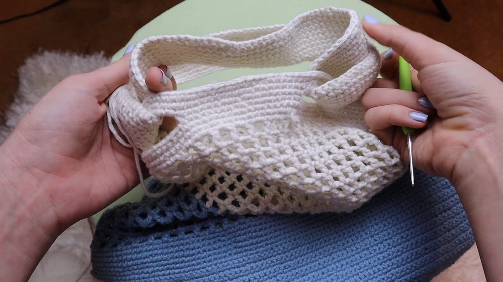 1. Finish off the rim by completing 3 rows of single crochet, working evenly into the chains for the handles.