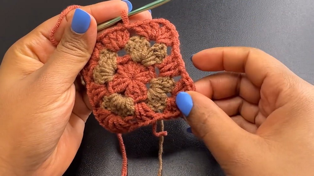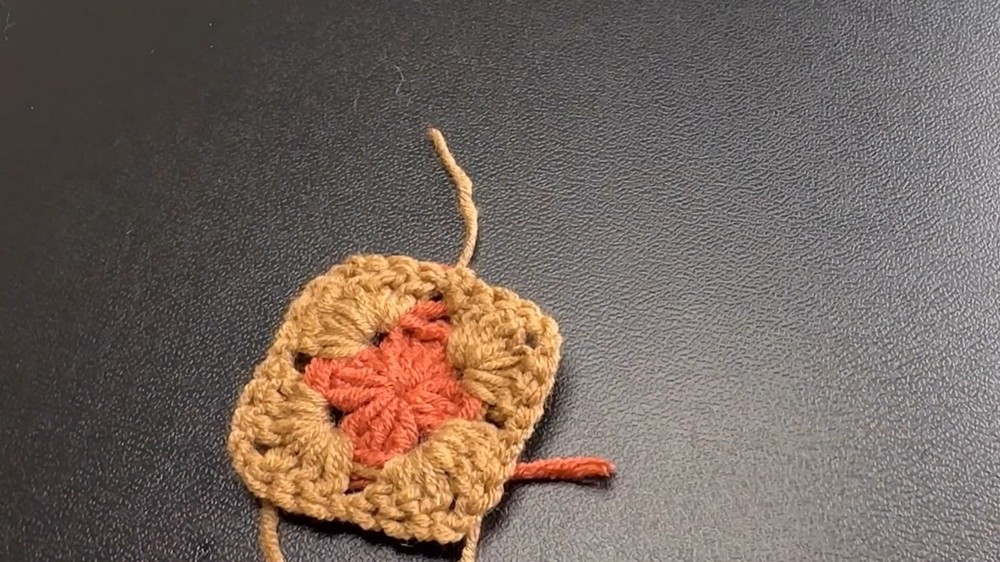 - 3 dc in ch-1 spaces, (3 dc, ch 2, 3 dc) in the center ch-2 corner.